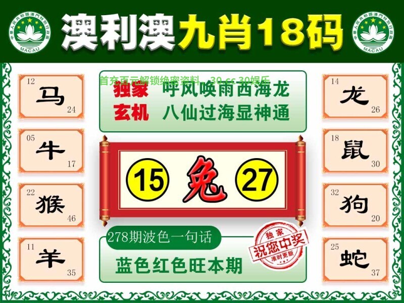 279期八肖 | 鸡猴马虎龙兔羊牛 | 开:兔27 |